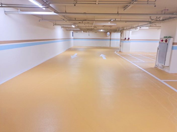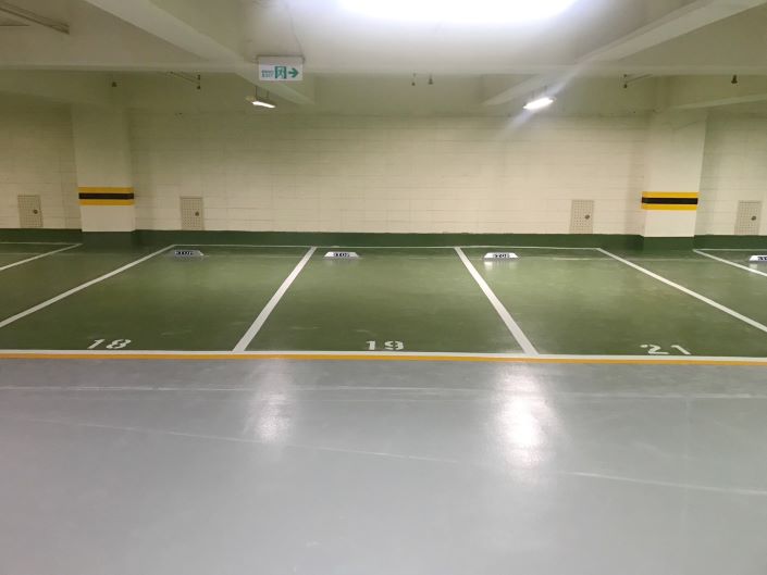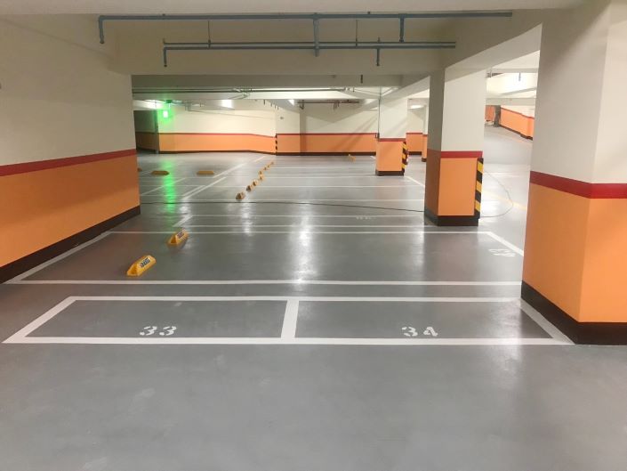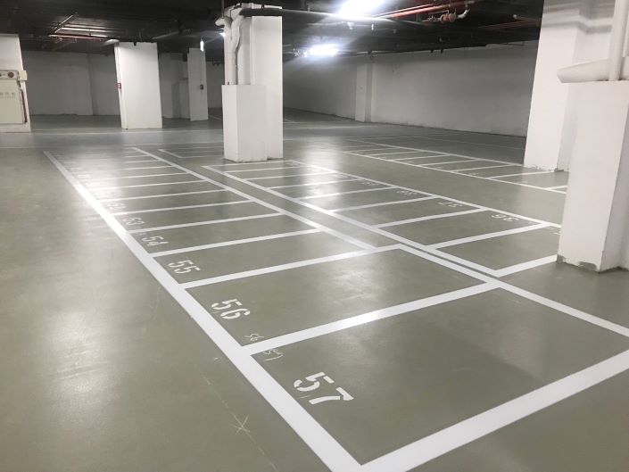 堆高機頻繁行走,加上溫度變化劇烈,中塗能有效提高抗壓與穩定性。第三,地下停車場與商用停車空間。